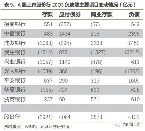 负债端加大同业存单发行或同业存款吸收规模。从A股上市股份行整体来看,受结构性存款压降影响,20Q3存款下降了2921亿元,为应对压降结构性存款影响,20Q3应付债券(同业存单是大头)增加4064亿元,同业存单增加了2873亿元。