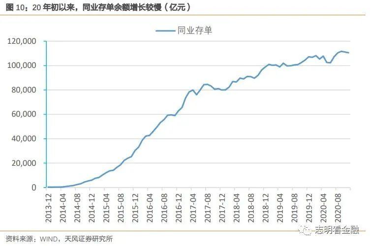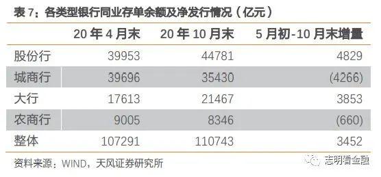 负债端明显加大了同业负债吸收力度。20年5月初-10月末期间,中小型银行金融债券净融资1.26万亿,同比大幅多增;此外,卖出回购及银银同业存单吸收规模增量均同比明显多增,这说明了在结构性存款压降之下,中小型银行加大了同业负债吸收力度。不过,具体从同业存单来看,20年5月初-10月末,股份行同业存单净发行4829亿元,城商行则压降了同业存单余额,农商行亦有所压降,中小型银行整体同业存单余额增加不明显。