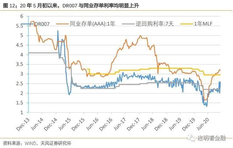 再次,年中以来不仅同业存单利率明显上涨,其他市场利率亦明显攀升。20年初以来,DR007利率大幅攀升,从1.3%左右升至2.2%以上,超过了当前央行7天逆回购利率。