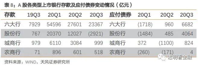 大型银行及农商行受结构性存款压降影响小。大型银行客户基础好,结构性存款依赖不高;农商行下沉市场,且多数没有结构性存款发行资质,因而受结构性存款压降影响小。从上市银行来看,20Q3六大行存款增加2.34万亿元,较Q2有所放缓,但同比大幅多增;上市农商行20Q3存款增加518亿元,较20Q2变动幅度较小,同比明显多增。