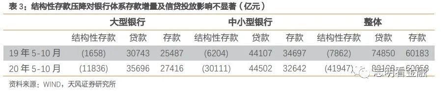 结构性存款压降对银行体系存款增量及信贷投放影响不显著。20年5月初-10月末,银行体系整体结构性存款大幅下降了4.19万亿元,同期存款增加了6.0万亿,与去年同期相当;新增贷款8.02万亿元,同比略微多增。可见,结构性存款压降对银行体系整体存款增量及信贷投放影响不显著。