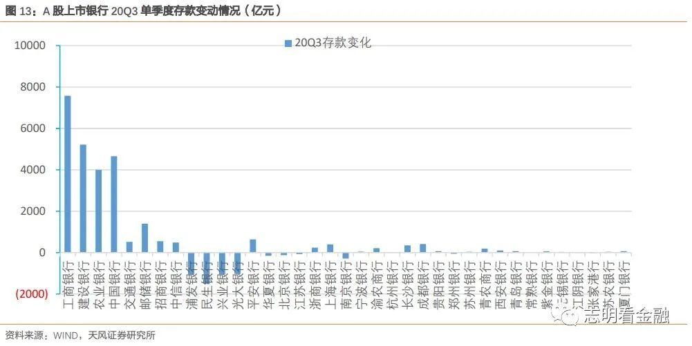 从具体银行来看,20Q3四大行及邮储银行存款增量较高,股份行中的浦发、民生、兴业和光大银行存款下降均超千亿元,受结构性存款压降影响较大。此外,城商行中北京、江苏、南京、郑州银行等存款规模20Q3有所下降。