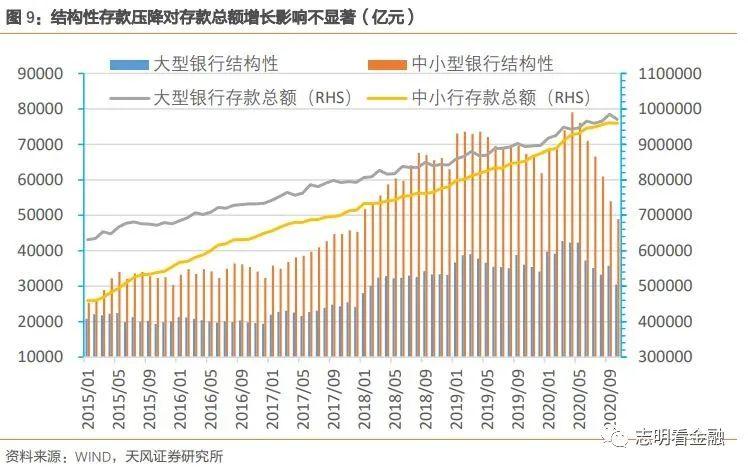 结构性存款压降对中小型银行整体存款增长有影响,但不大。20年5月初-10月末期间,中小型银行整体结构性存款大幅下降3.01万亿元,同期存款增加3.26万亿元,同比少增0.2万亿元。考虑到同期中小型银行资产规模扩张了5.35万亿元,同比明显多增,可以说压降结构性对其存款增长造成了一定影响,但存款增量并未大幅下降,说明影响并非特别大。
