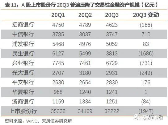 金融投资具体来看主要是压降了交易性金融资产规模。资产适度“缩表”的民生银行20Q3交易性金融资产大幅下降了1686亿元,兴业银行20Q3压降了731亿元,上市股份行合计20Q3压降交易性金融资产1947亿元。交易性金融资产主要为以交易为目的的债券投资、货币基金和债券基金投资。在负债端压力之下,我们预计部分股份行20Q3明显缩减了货币基金和债券基金投资。