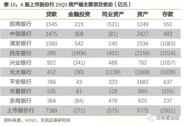 从受结构性存款压降影响较大的浦发、民生、兴业、光大等4家股份行来看,除了民生银行外,20Q3信贷增长均相对正常,说明银行仍然会优先信贷投放。20Q3适度缩减负债规模的光大银行在资产端主要是大幅压降了同业资产,民生银行则大幅压降金融投资规模和小幅压降了同业资产规模。
