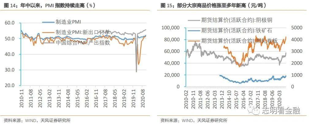 这轮经济复苏的强度或较强。20年年中以来PMI持续改善,11月制造业PMI中新出口订单指数达51.5%,制造业PMI达52.1%,预示着出口将进一步向好和制造业产出进一步改善。部分周期品(铜、冷轧钢、铁矿石等)价格创近年新高,叠加低基数,2021年PPI有望大幅上升,国内经济仍处于复苏通道中。这一轮经济复苏的强度或比肩2017年。