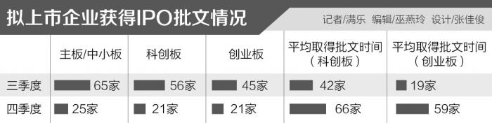 wind统计数据显示,10月至今,共有21家申报科创板的企业通过证监会注册拿到批文,而整个三季度则有56家企业取得在科创板的IPO批文。创业板四季度同样有21家企业拿到批文,三季度则有45家。