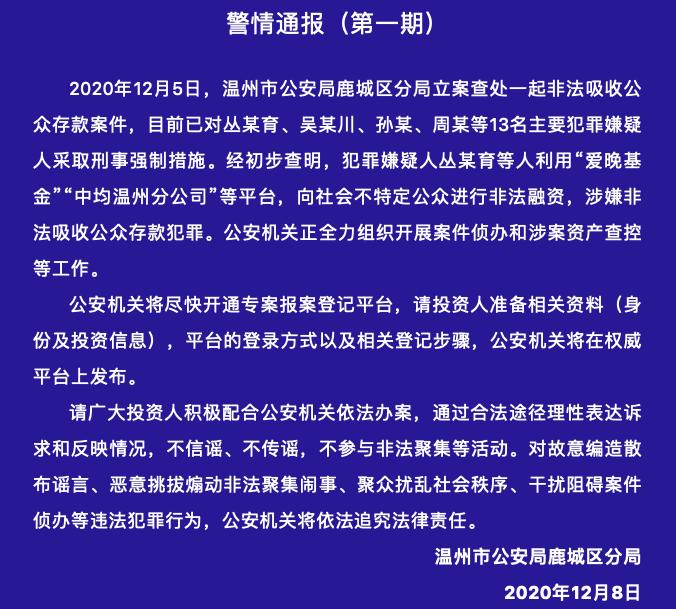 经初步查明,犯罪嫌疑人丛某育等人利用“爱晚基金”、“中均温州分公司”等平台,向社会不特定公众进行非法融资,涉嫌非法吸收公众存款犯罪。公安机关正全力组织开展案件侦办和涉案资产查控等工作。