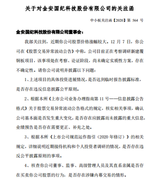 12月8日,金安国纪公告,公司收中小板关注函,此前公司称目前正在考察调研新建覆铜板项目,该事项处在考察、论证阶段,尚未确定实质性方案,存在不确定性。