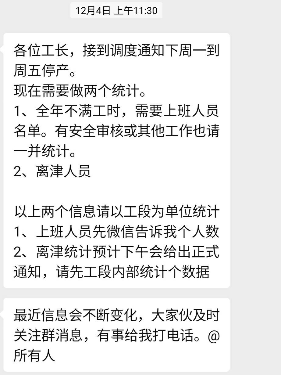 王明是一汽大众天津分公司的一名员工,上周五下班后,他就收到了工作群中的停工停产的通知。据他介绍,这个消息是群发的,也就是说天津公司将近3000名员工在本周就停工了。