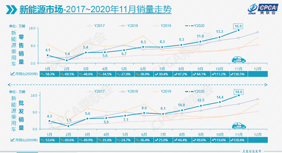 (1)国内乘联会发布的数据显示,11月新能源车零售16.9万辆,同比增速136.5%,乘用车零售市场渗透率8.0%,成为乘用车零售增长核心动力。此外,新能源乘用车批发销量为18万辆,同比增长高达128.6%,环比10月增长24.8%。