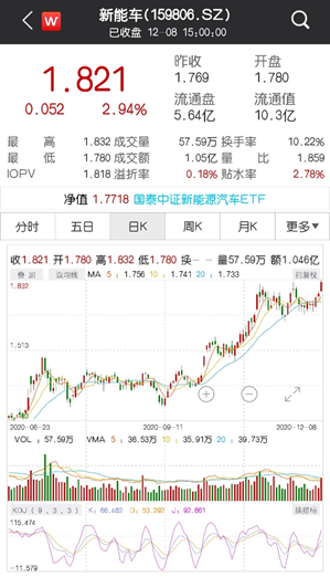 8日新能源汽车板块再度表现强势。新能车ETF(159806)早盘高开后持续拉升并创出新高1.832元,随后全天保持高位震荡,最终收涨2.94%。