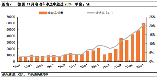(2)海外方面,平安证券的新能源汽车行业周报显示,11月欧洲电动车销量同比继续大幅增长,德国再创历史新高。而未来还有一个很可能超预期的点就是美国的新能源汽车需求,作为全球大的汽车消费国之一,美国电动车销量连续3年30万辆左右,无增长,渗透率仅2%,渗透率提升空间较大。