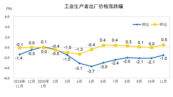 2020年11月份,全国工业生产者出厂价格同比下降1.5%,环比上涨0.5%;工业生产者购进价格同比下降1.6%,环比上涨0.7%。1―11月平均,工业生产者出厂价格比去年同期下降2.0%,工业生产者购进价格下降2.5%。