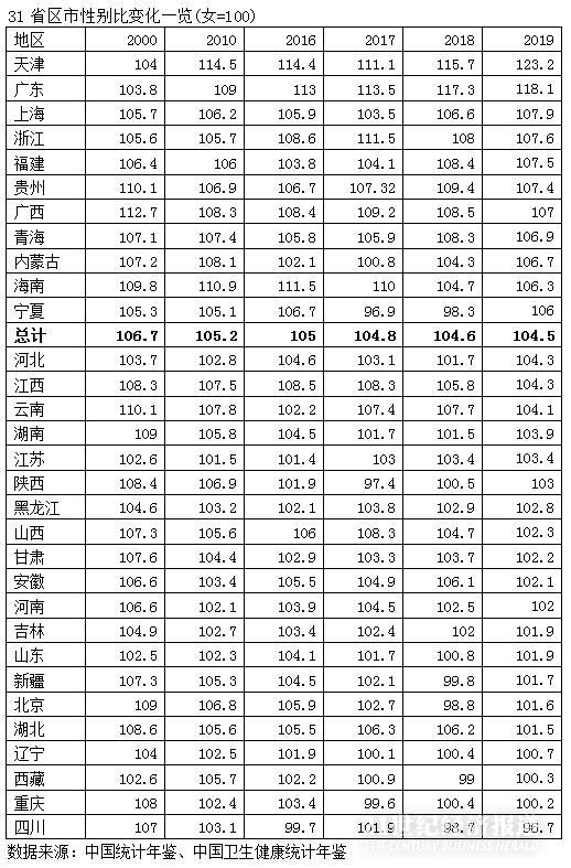 值得关注的地区还有北京。2019年,北京的性别比为101.6,排名全国性别比倒数第6位,性别比趋向平衡。在2018年,北京还出现首次性别比跌破100的局面。