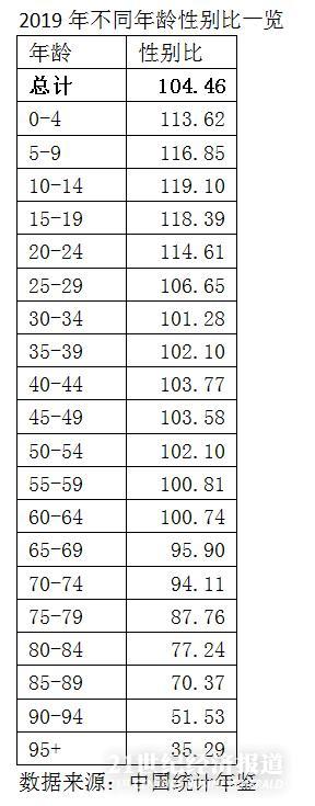 2019年,我国性别比失衡现象进一步改善。2018年中国总人口性别比为104.64,这一数字到2019年缩小到104.46。