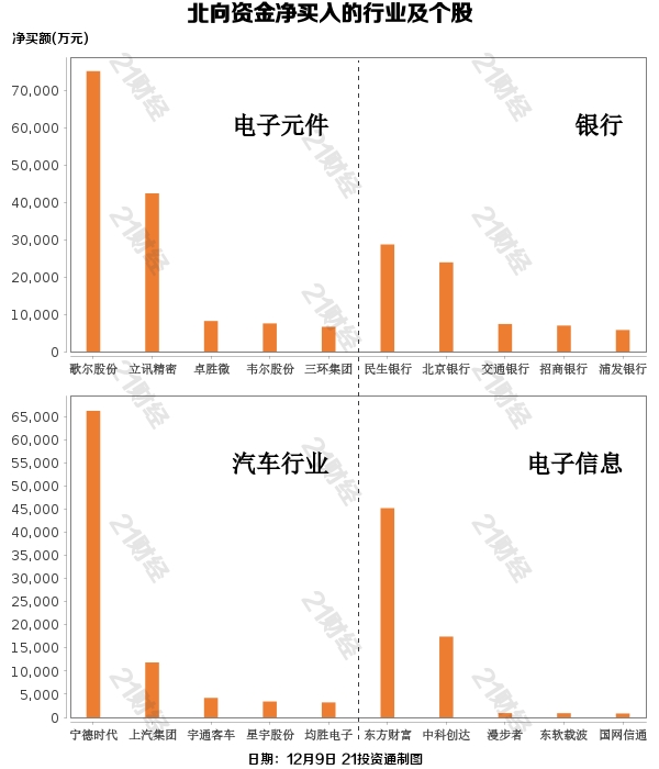 个股方面,歌尔股份获净买入7.43亿,宁德时代获净买入6.66亿。近日,苹果发布头戴式耳机AirPods Max,有报道称该耳机由歌尔股份独家代工,今日歌尔股份高开高走,收涨7.72%,成交近70亿元。
