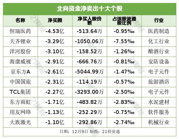 其中,恒瑞医药被净卖出4.53亿元,天齐锂业被净卖出3.29亿元,洋河股份被净卖出3.10亿元,海康威视被净卖出2.91亿元,京东方A被净卖出2.61亿元。