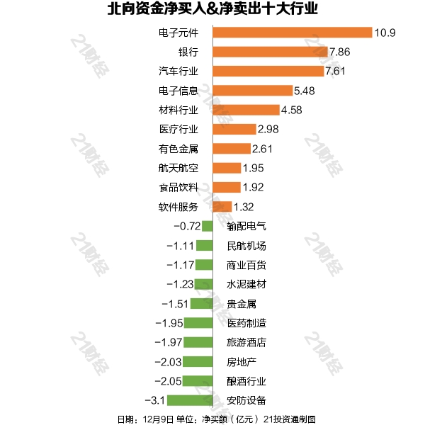 从净买入金额来看,北向资金增持了30个行业,其中电子元件居首,净买入金额达10.90亿元;其次是银行,净买入7.86亿元。