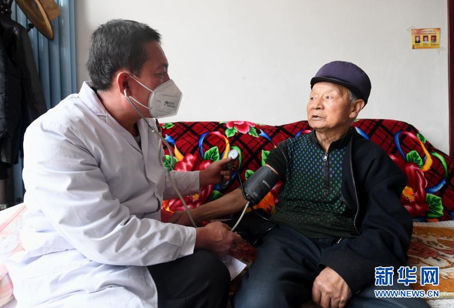 河北阜平县龙泉关镇顾家台村村医为村民测量血压(4月15日摄)。新华社记者王晓摄