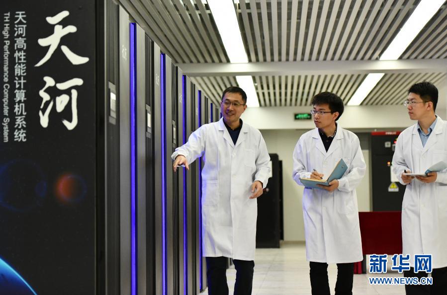 在国家超级计算天津中心“天河三号”原型机机房内,应用研发部部长孟祥飞(左)和同事一起巡查(2019年4月24日摄)。新华社记者李然摄