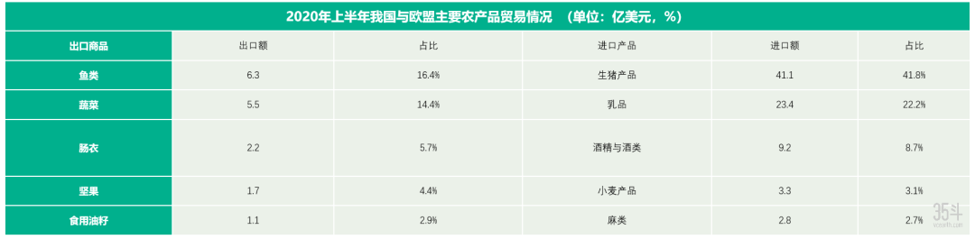 图:2020年上半年我国与欧盟主要农产品贸易情况 (单位:亿美元,%)