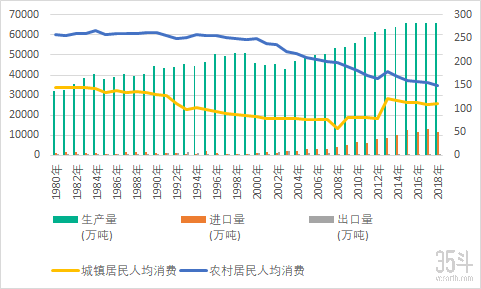 中国人口占世界的近1/5,粮食产量约占世界的1/4。《中国的粮食安全》白皮书显示,中国粮食总产量连上新台阶,2010年突破5.5亿吨,2012年超过6亿吨,2015年达到6.6亿吨,连续4年稳定在6.5亿吨以上水平。2018年产量近6.6亿吨,比1996年的5亿吨增产30%以上。目前,中国人均粮食占有量达到470公斤左右。膳食品种也愈发丰富,油料、猪牛羊肉、水产品、牛奶、蔬菜、水果的人均产量亦在全球领先。