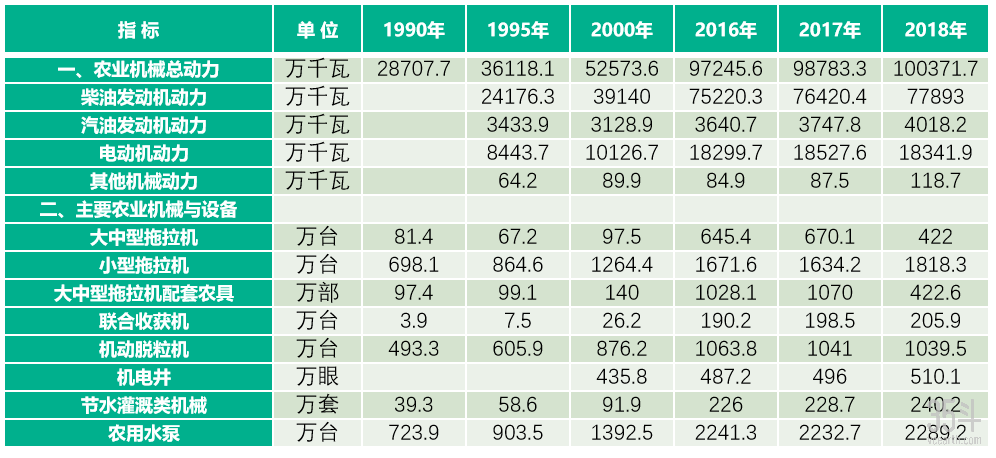 农业的大发展,现代化设施设备的应用功不可没。就粮食作物而言,主要是各类农业机械的使用,比如各类拖拉机、旋耕机、自动化机械,截至2018年末,农业机械总动力达到100371.7千万时,相对应的是,1978年这一数据为11749.9千瓦时,增长了7倍有余,农作物耕种收综合机械化水平达到了70%左右,机耕、机播、机收三项数据之中,机耕率超过了80%。