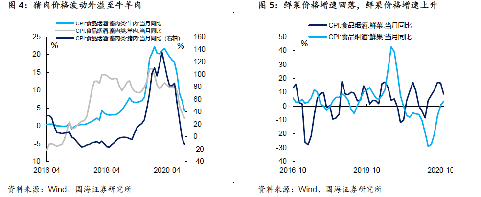 其他食品项方面,牛羊肉价格受猪肉价格外溢影响,继续下降;蔬果方面走势发生背离,鲜菜价格受去年基数较高影响叠加供给改善增速继续回落,鲜果价格增速继续上升。