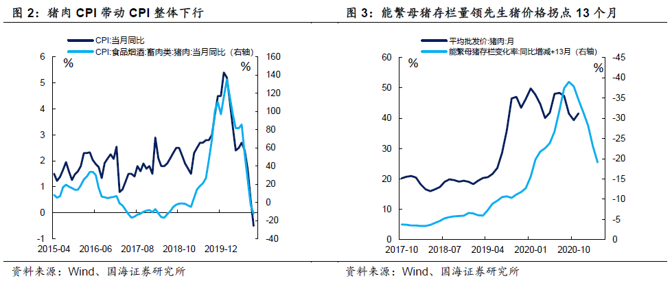 11月份食品项CPI同比下降2.00%,同比增速较上月下跌4.2个百分点。猪肉CPI项增速继续回落,是CPI增速下行的主要原因,猪肉CPI项对CPI整体的拉动,由10月份的-0.13%下行至11月份的-0.60%。