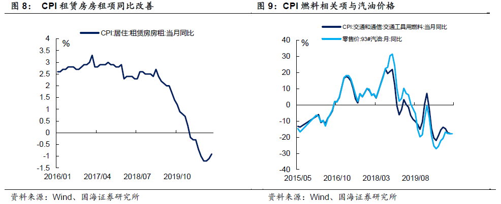租赁房租与生活用品类同比有所回升。11月份,生活用品类CPI同比增速收于0%,较上个月同比增速上升0.1个百分点。其中衣着类CPI同比下降0.3%,增速较上月持平;租赁房房租CPI同比减少0.9%,较上个月同比增速上升0.2个百分点。