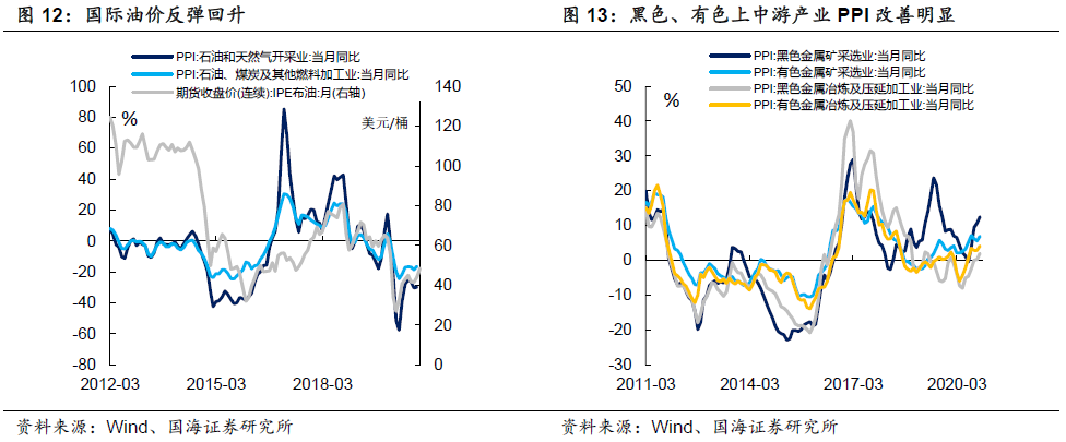 国际油价改善,国内复工复产火热。海外方面,天气转冷,叠加感恩节出行人数剧增,11月份海外疫情有进入二次爆发的趋势,但是疫苗重大利好消息不断,最早一轮疫苗接种将在圣诞节前两周展开,并且众议院对新一轮刺激法案讨论进入白热化,通胀预期升温,对国际油价产生明显支撑作用。国内方面,正如我们前期报告所述,目前国内生产恢复仍在继续,中下游产业多数进入主动补库阶段,链条式拉动上游产业生产;国外进口缺口仍未修复,对国内出口需求也将拉动产业自下而上改善。PPI方面,与我们之前研判一致,将进入上行期,于明年5月份达到增速峰值。