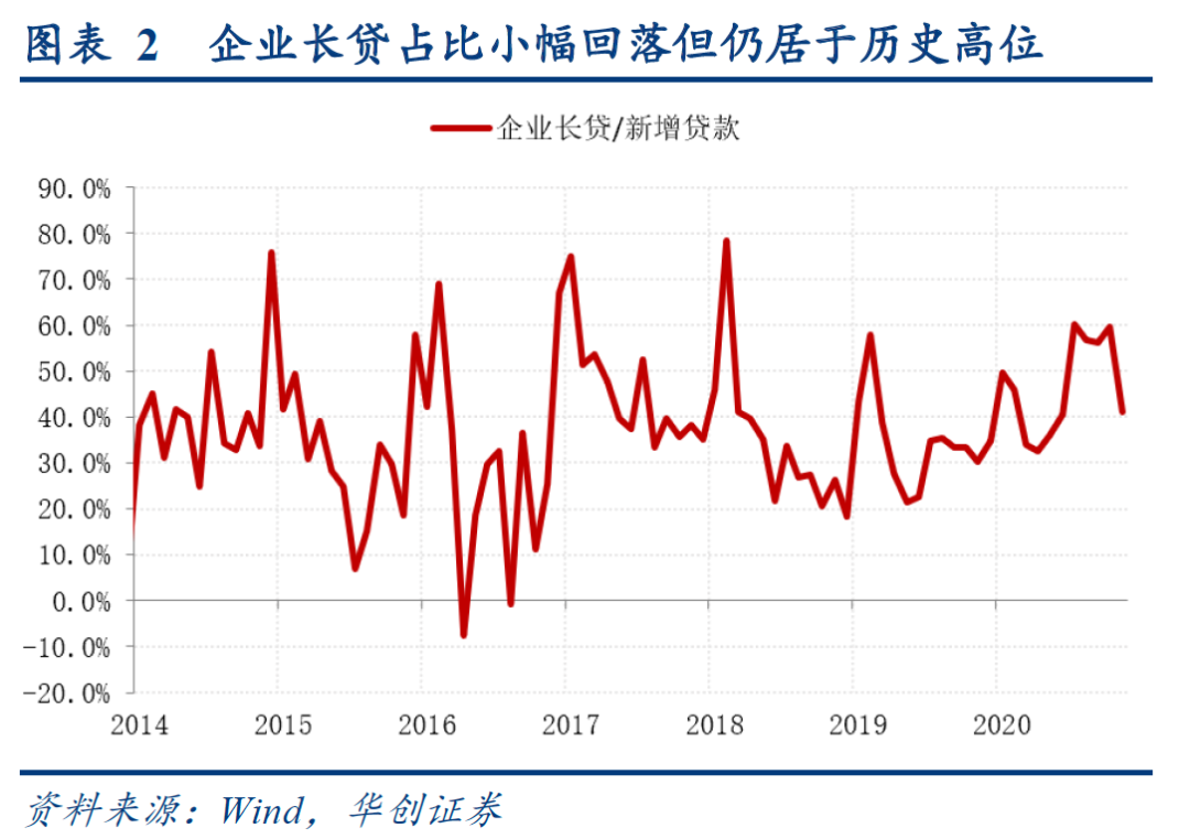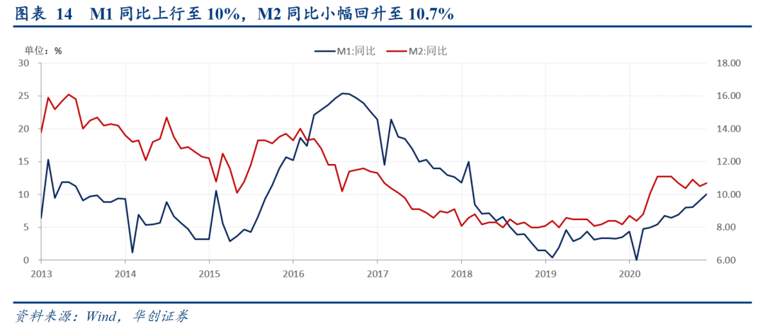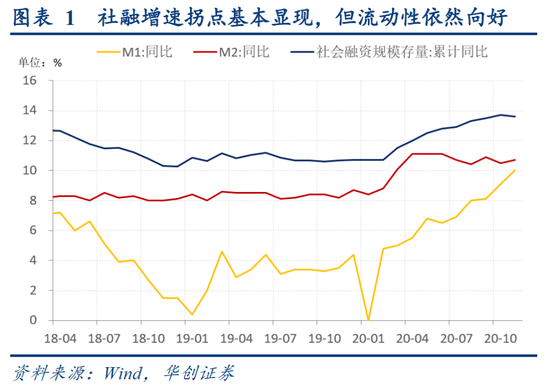 但信用扩张的触顶不等于当前实体融资需求和流动性将就此剧烈转向。融资需求仍然不弱,对实体投放的信贷本月维持千亿级别的多增,企业长贷占新增贷款的比重虽然有所下降,但依然处于历史高位。实体流动性积极向好,信贷不弱配合年底的财政支出,M2本月小幅回升到10.7%,M1同比更攀升至10%超出市场预期,我们预计拐点将在明年年初,触顶16%左右,再伴随着房地产销售的回落、表外融资的收紧和财政力度的收敛而开启下行,于2021年底回落至8%左右。