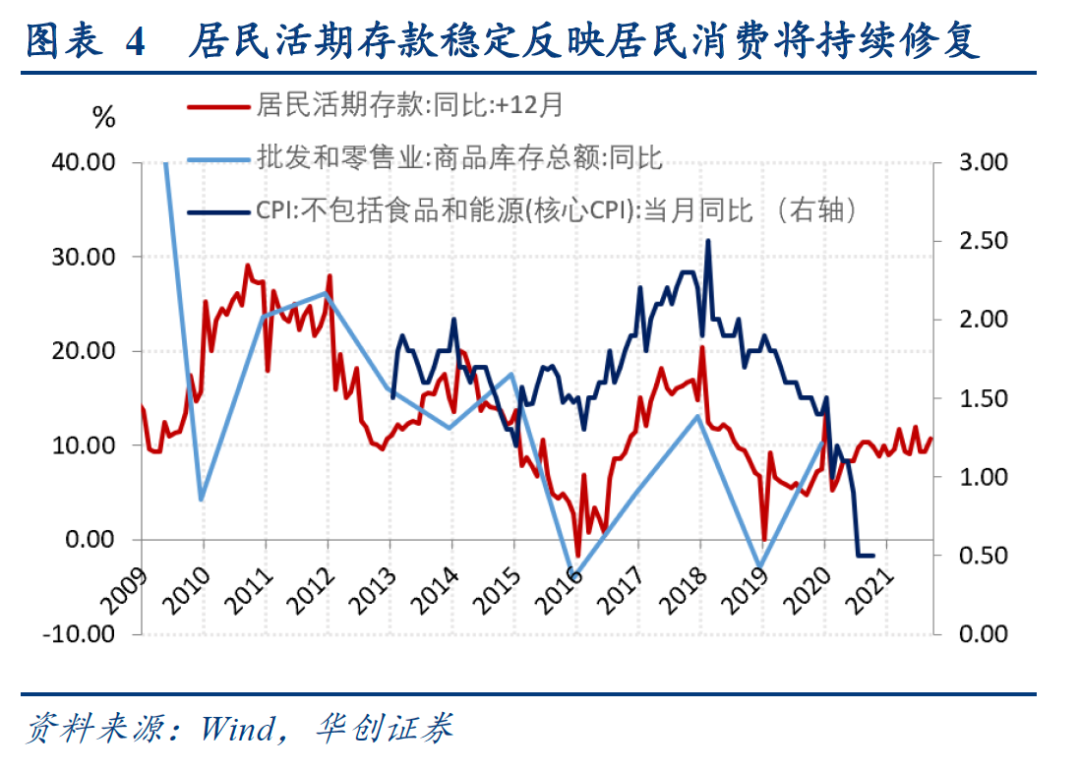 信用扩张虽然基本触顶,但支持实体经济的效用仍在继续释放,经济顺周期修复的动能仍在强化。最直接的观测指标就在持续快速上行的M1。M1同比对工业企业库存周期和大宗商品价格具有稳定的领先关系(1年左右),M1高增代表企业资金的活化比例持续提高,经营和生产行为持续活跃,经济顺周期修复的动能持续强化。