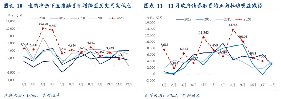 此外,政府债券11月净融资4000亿元,同比多增2284亿,尽管同比来看政府融资依然对社融形成支撑,但是伴随发行进程接近尾声,拉动力明显减弱。直接融资11月新增1633亿元,同比大幅少增逾2000亿,其中债券净融资下降至862亿,同比少增近2500亿,股权融资规模771亿,同比多增247亿。