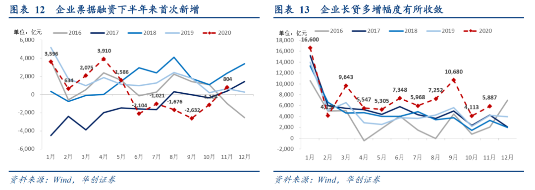 细项数据看,向实体投放的人民币贷款11月新增1.53万亿,同比多增1667亿,反映实体部门整体的融资需求依然不差。表外融资11月收缩2044亿元,同比多减981亿元,其中未贴现银行承兑汇票收缩626亿(前值:收缩1089亿),委托贷款收缩31亿元(前值:收缩174亿元),信托贷款收缩1387亿元(前值:收缩875亿元)。表外融资本月收缩幅度较大,一部分原因是房地产融资全面收紧下信托贷款萎缩提速,另一部分原因是本月的未贴现承兑汇票收缩并且同比还少增了1196亿,或与疫情后高增的开票陆续到期有关,同时不排除有部分银行以票据替代短贷的可能。