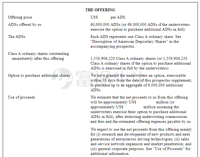 在本次ADS发行中,预计所筹款项的约60%将用于新产品与下一代自动驾驶技术的研发;约30%用于销售、服务网络扩张与市场渗透;剩余约10%用于一般企业用途。