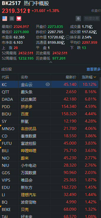 大型中概股方面,阿里巴巴涨0.4%,京东跌0.1%,腾讯ADR涨1.6%,百度涨4.4%,至2019年5月初以来最高,网易跌1.8 %,拼多多涨4.6%,哔哩哔哩涨3.6%收盘再创新高,蔚来盘初跌4.8%后收涨2.8%,小鹏汽车涨0.5%,理想汽车涨1.4%。