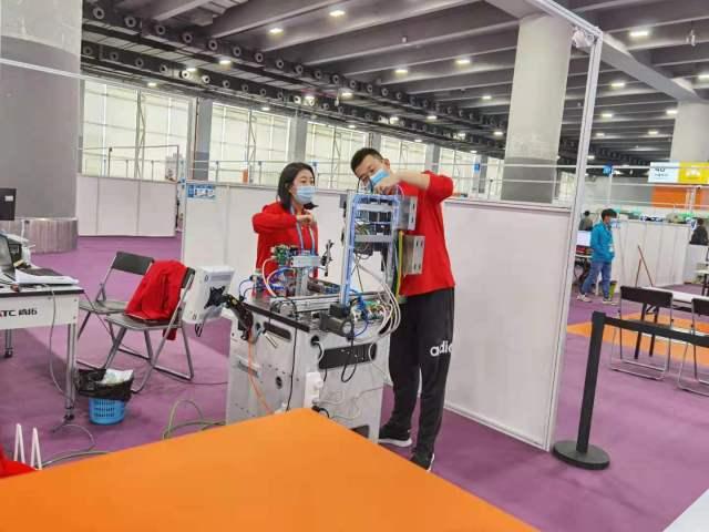 下午3时许,在第一届全国技能大赛工业4.0项目中,各个队伍的2名选手在互相配合,给身前的钻孔装配机器连上多种线路,准备搭建网络组网,从而使早上组建的自动化生产线能够顺利联网。