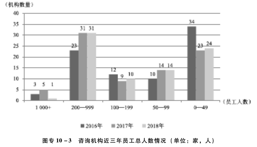 图1-3 咨询机构近三年员工总人数情况(单位:家,人)