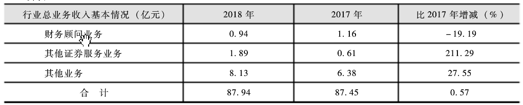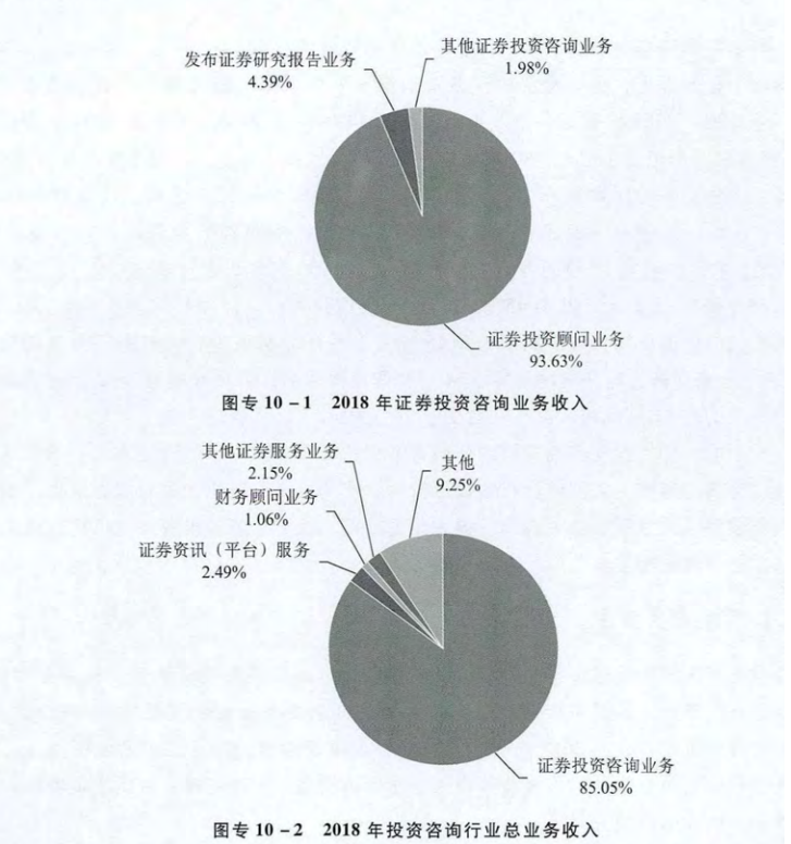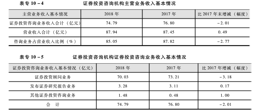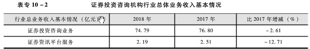 2018年证券投资咨询业务收入占营业收入的比例为85.05%,较2017年的87.82%有所下降,但业务收入占比仍然较高;投资顾问业务收入依然是咨询业务收入的主要来源,其收入较2017年略有减少,这也是2018年证券投资咨询业务收入减少的主要原因。发布证券研究报告业务和其他证券投资咨询业务收入虽有增长,但由于体量较小,对证券投资咨询业务的收入贡献有限(表专10-4和表专10-5)。