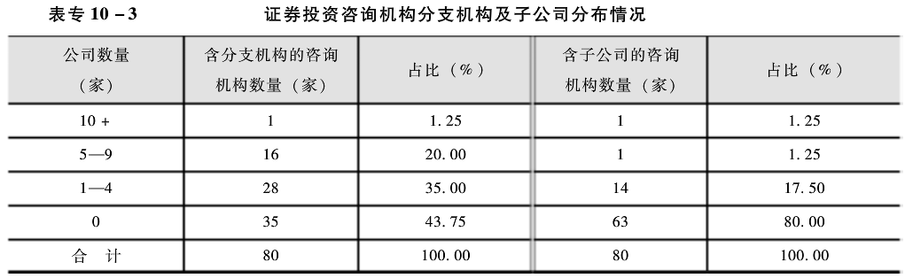 表1-3 证券投资咨询机构分支机构及子公司分布情况