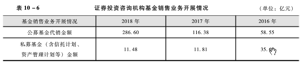 在基金销售方面,截至2018年12月31日,已有9家咨询机构取得基金销售业务资格,3家咨询机构开展了私募基金代销业务(含信托计划、资产管理计划等)。2018年咨询机构基金销售业务整体大幅增长。其中,代销公募基金金额286.60亿元,比2017年增长146.26%;代销私募基金金额11.48亿元,与2017年基本持平(见表专10-6)。