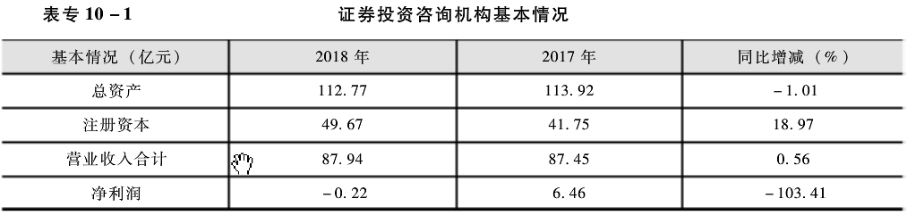 截至2018年12月31日,参与问卷调查的80家证券投资咨询机构2018年实现行业营业收人稳计87.94亿元,同比增长0.56%;行业净利润总计亏损0.22亿元,同比下降103.41%;行业总资产总计112.77亿元,同比下降1.02%;行业注册(实缴)资本总计49.67亿元,同比增加18.97%(见表专10-1)。
