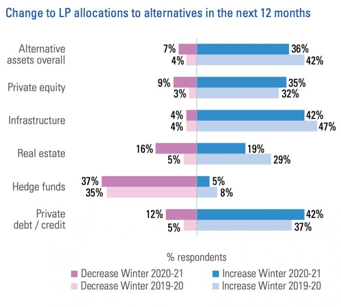从投资者风险偏好的角度来看,三分之二的LP认为经过这次疫情,私募投资者在进行资产配置与建立投资组合时,会多加考量疫症、气候变化、地缘政治等结构性风险。