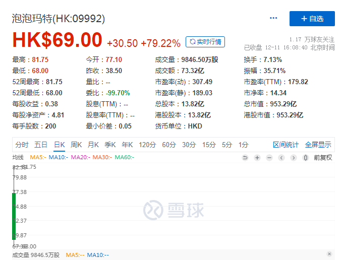 2020年12月11日,泡泡玛特登陆港交所,开盘涨100%报77.1港元,总市值达1065亿港元。