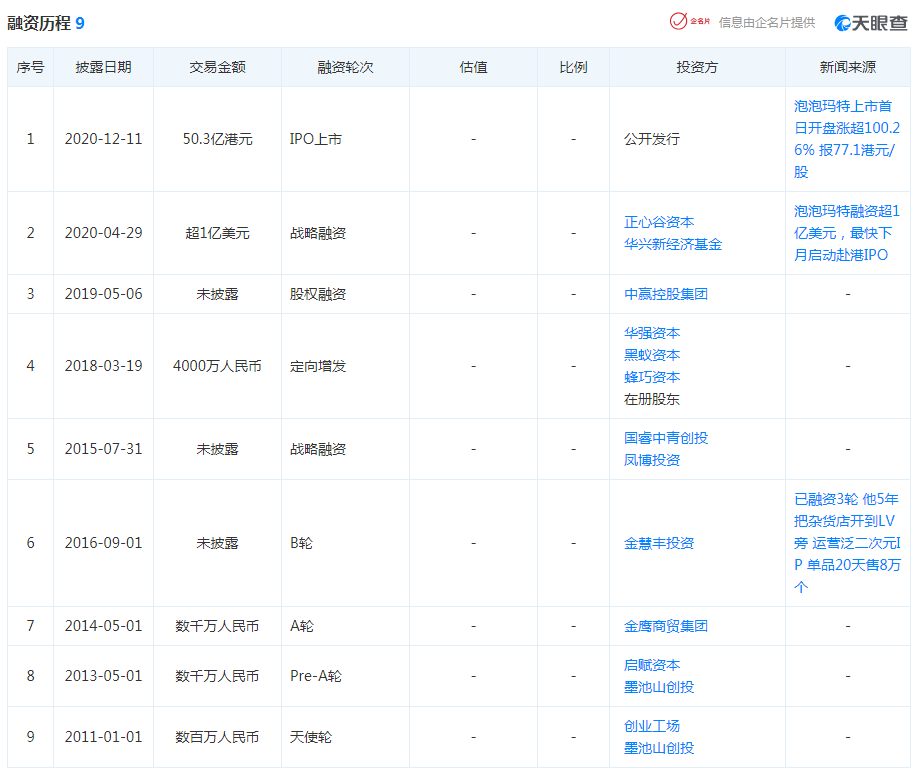 天眼查显示,从2010年成立以来,泡泡玛特经历了8轮融资,得到众多VC、PE加持。