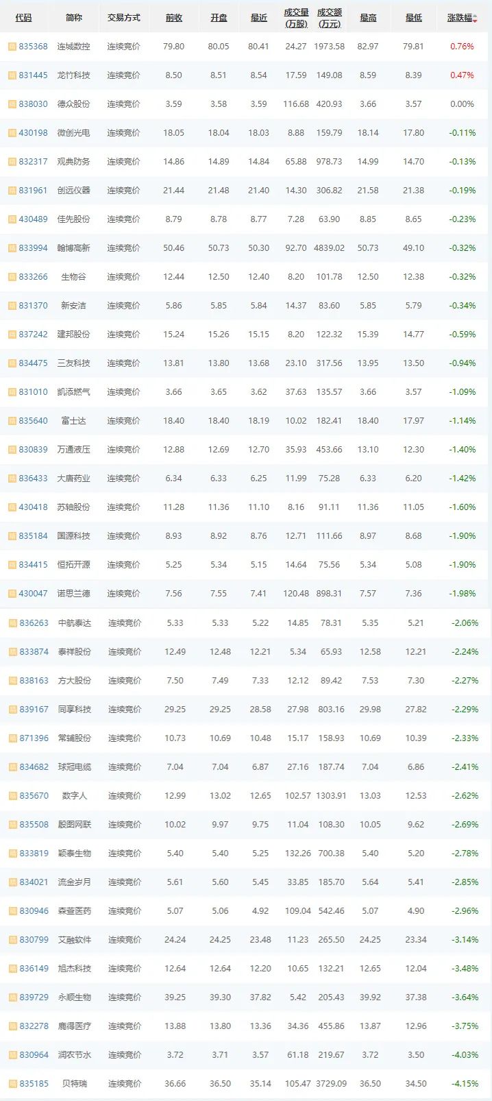 12月11日,精选层普跌,37家企业2家涨,1家平盘,34家跌;其中,连城数控(835368)涨幅居首,上涨0.76%;其次,龙竹科技(831445)上涨0.47%;贝特瑞(835185)跌幅居首,下跌4.15%;润荣节水(830964)居次,下跌4.03%;德众股份(838030)等平盘。
