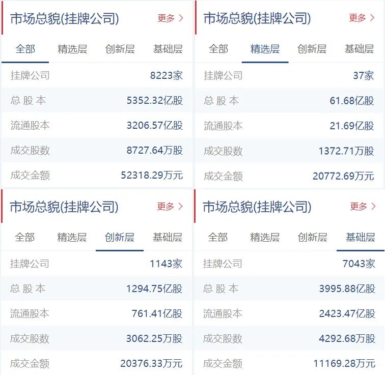 新三板挂牌公司总计8223家(精选层37家,创新层1143家,基础层7043家),总股本5352.32亿股,流通股本3206.57亿股。