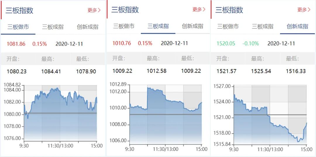 截至12月11日收盘,三板做市报1081.86点,上涨0.15%;三板成指报1010.76点,上涨0.15%;三板创新成指报1520.05点,下跌0.10%。